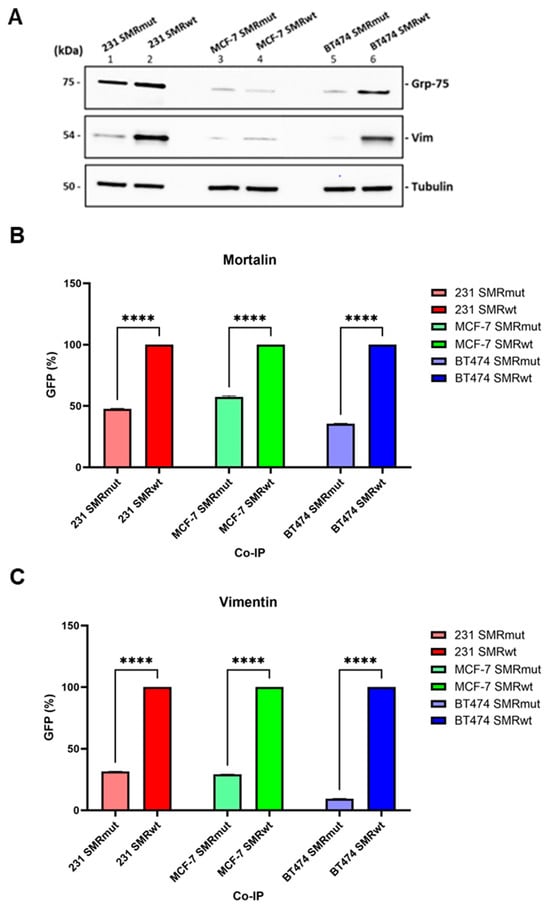 The SMRwt peptide specifically interacts with host cell proteins, including Mortalin and Vimentin. (A) Proteins from MDA-MB-231, MCF-7, and BT474 BC cells were co-immunoprecipitated with either SMRwt or SMRmut peptides using an anti-FLAG M2 antibody-coupled affinity resin. The procedure was also performed without the peptides as a control for nonspecific interactions. (B) Mortalin and (C) Vimentin. Densitometric analysis of Western blot data using the NIH ImageJ software 1.52 (NIH, Bethesda, MD, USA) (due to its sensitivity to pixel density and background correction) revealed significant differences: SMRmut vs. SMRwt **** p < 0.00005 in MDA-MB-231, **** p < 0.00005 in MCF-7, and **** p < 0.00005 in BT474 cells when probed with a Mortalin (Grp-75) antibody; **** p < 0.00005 in MDA-MB-231, **** p < 0.00005 in MCF-7, and **** p < 0.00005 in BT474 cells when probed with a Vimentin antibody.