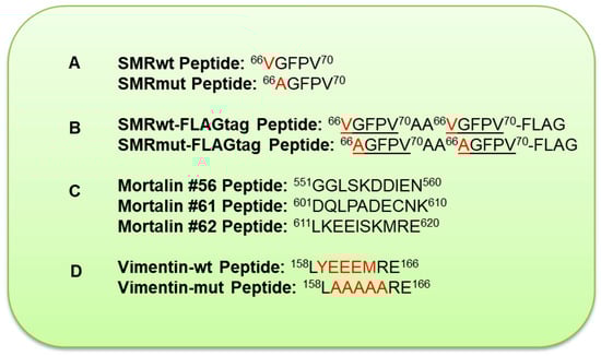 Differences between WT (wild-type) and MUT (mutant) peptides. (A) SMR peptides (HIV-1 Nef protein sequence has 206 AA): Schematic representation of the wild-type (SMRwt) and negative-control (SMRmut) synthetic peptides derived from HIV-1 Nef (206 AA) []. The difference: The first amino acid in the sequence changes from valine (V) in the WT peptide to alanine (A) in the MUT peptide. (B) SMR-FLAGtag peptides (HIV-1 Nef protein sequence has 206 AA): Schematic representation of the wild-type (SMRwt) and negative-control (SMRmut) synthetic peptides derived from HIV-1 Nef (206 AA) [], showing sites of amino acid changes in SMRmut. Each peptide contains a FLAG tag at the C-terminus. The difference between SMRwt-FLAGtag and SMRmut-FLAGtag is that SMRwt-FLAGtag contains a valine (V) at the first position, while SMRmut-FLAGtag contains an alanine (A) at the first position. (C) Mortalin peptides: The Mortalin protein sequence has 679 AA. The sequences of Mortalin #61 and #62 show regions implicated in binding the HIV-1 Nef and SMRwt peptide. Mortalin #56 did not bind to Nef or the SMRwt peptide. The difference: These peptides are entirely different sequences, each representing different segments of the Mortalin protein. (D) Vimentin peptides: The Vimentin sequence has 466 AA. The difference between the Vimentin-wt peptide (LYEEEMRE) and the Vimentin-mut peptide (LYEEEMRE, red) lies in the substitution of the sequence YEEEM with AAAAA in the mutant peptide. This change significantly alters the peptide’s structure and function.