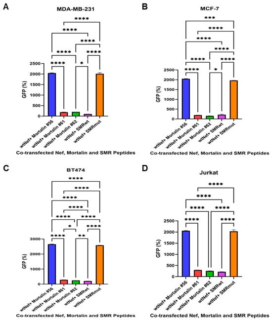 Effects of Mortalin-derived peptides on viral Nef-driven exNef secretion. (A) MDA-MB-231, (B) MCF-7, (C) BT474 BC cells, and (D) Jurkat T cells were co-transfected with 1 µg of wild-type Nef-GFP clone and 200 ng of various Mortalin-scanning peptides. The cells were then placed in a 24-well plate and incubated at 37 °C for 24 h before being assayed for extracellular vesicle secretion. Cells were also co-transfected with SMRwt or SMRmut peptides as positive and negative controls, respectively. The amount of GFP fluorescence measured was equivalent to the amount of exNef-GFP in the extracellular media. We determined that the Mortalin peptide #56 does not interact with the NefSMR domain and does not affect Nef function. In contrast, Mortalin peptides #61 and #62 can interact with the NefSMR domain and inhibit Nef function. The bar graphs display relative levels of exosome release. In here, asterisks (* p < 0.05, ** p < 0.005, *** p < 0.0005, and **** p < 0.00005) are used to indicate levels of statistical significance. The more asterisks, the stronger the statistical significance. Data represents the mean ± SD from three independent experiments.