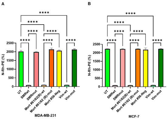 Effects of SMR, Mortalin, and Vimentin peptides on tumor cell exosome secretion in MDA-MB-231 and MCF-7 breast cancer cells. MDA-MB-231 and MCF-7 BC cells (200 µL, 1 × 104 cells/mL) were seeded into a 96-well plate and treated with 100 ng/mL of either wild-type (wt) or mutant (mut) peptides of SMR, Mortalin, or Vimentin. Treatments were performed in RPMI-1640 medium without transfection, and cells were incubated at 37 °C for 24 h. The cells were then treated with 0.5 µM/mL of N-Rh-PE, incubated at 4 °C for 1 h, and washed with PBS. Fresh medium was also added. The cultures were incubated at 37 °C for an additional 24 h. N-Rh-PE refers to N-(Lissamine Rhodamine B sulfonyl) phosphatidyl-ethanolamine, a fluorescent lipid dye commonly used to label membranes and track vesicle trafficking. (A) MDA-MB-231 Cells: Data analysis of exosome release revealed significant differences: UT vs. SMRwt, Mort #61/62(B)-wt, VIM-wt **** p < 0.00005 in MDA-MB-231. (B) MCF-7 Cells: Data analysis of exosome release revealed significant differences: UT vs. SMRwt, Mort #61/62(B)-wt, VIM-wt **** p < 0.00005 in MCF-7. Exosome secretion was assessed by measuring the amount of N-Rh-PE, which corresponds to the number of exosomes released into the extracellular medium. Bar graphs show the relative exosome release level. Data represent the mean ± SD of three independent experiments.