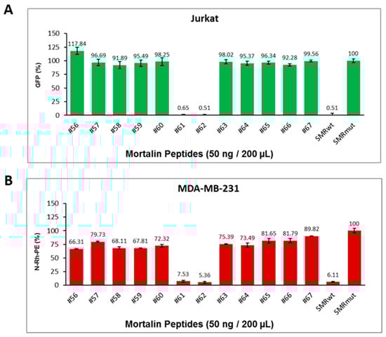Effects of Mortalin-derived peptides on inhibition of exNef and tumor exosome secretion. (A) Jurkat T cells were co-transfected with 250 ng of wild-type Nef-GFP plasmid and 50 ng of Mortalin-derived scanning peptides (#56–#67), including SMRwt and SMRmut as positive and negative controls. After 48 h, GFP fluorescence in culture media was measured to assess exNef secretion. Data represent mean ± SD from three independent experiments. Statistical significance was determined using a two-sample t-test assuming equal variances. (B) MDA-MB-231 cells were transfected with 50 ng of Mortalin-derived scanning peptides (#56–#67), including SMRwt and SMRmut controls. Cells were labeled with N-Rh-PE and incubated for 48 h. N-Rh-PE fluorescence in culture media was measured to assess exosome secretion. Data represent mean ± SD from three independent experiments. Statistical significance was determined using a two-sample t-test assuming equal variances.