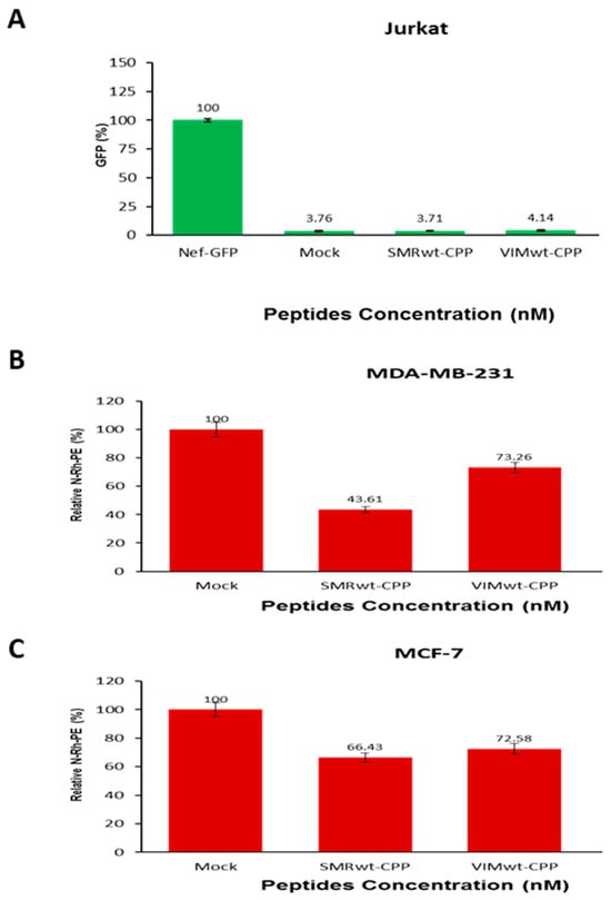 SMRwt and VIMwt peptides decrease extracellular vesicle secretion in Jurkat T cells and breast cancer cells. (A) Jurkat T cells were co-transfected with 1 µg of wild-type Nef-GFP plasmid and treated with either 349.6 nM SMRwt-CPP or 357.27 nM VIMwt-CPP peptides. After 24 h at 37 °C, culture media were collected and assayed for extracellular vesicle (EV) secretion using GFP fluorescence as a proxy. (B,C) MDA-MB-231 and MCF-7 breast cancer cells were treated with either 349.6 nM SMRwt-CPP or 357.27 nM VIMwt-CPP peptides for 24 h at 37 °C. Cells were then labeled with 5 µM N-Rh-PE at 4 °C for 1 h, washed, and incubated in fresh media for an additional 24 h. Supernatants were assayed for EV secretion using N-Rh-PE fluorescence. Bar graphs show relative EV levels. Data represent mean ± SD from three independent experiments. Statistical comparisons were performed using appropriate tests; p-values are indicated.