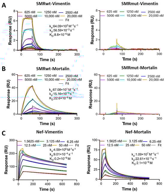 SPR analysis of SMRwt, SMRmut, and Nef binding to Vimentin and Mortalin. (A) Binding of SMRwt (left) and SMRmut (right) to immobilized Vimentin. (B) Binding of SMRwt (left) and SMRmut (right) to immobilized Mortalin. (C) Binding of Nef protein to immobilized Vimentin (left) and Mortalin (right). Colored lines represent experimental data, while black lines indicate fits to a 1:1 kinetics binding model. The derived kinetic parameters are displayed. Three independent experiments were performed, with one representative run shown here.