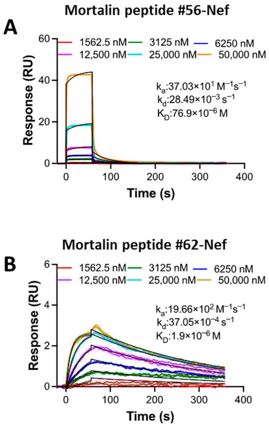 Figure 8 depicts the SPR results for Mortalin peptides binding to Nef. The Nef protein was immobilized as a ligand on the chip surface, and the peptides were used as analytes to flow into the buffer solution. Fitting of the SPR sensorgrams to a 1:1 kinetics binding model resulted in a weaker affinity (a higher KD value) for Mortalin peptide #56 (Figure 8A) compared with the affinity value for Mortalin peptide #62 (Figure 8B) binding to immobilized Nef. The 40-fold difference in KD values between Mortalin peptides #56 and #62 for binding to Nef suggests that peptide #62 may be more effective at disrupting Nef’s interactions with other partners in associated signaling pathways.