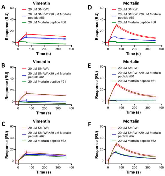While the competition experiments with Mortalin peptide #56 (Figure 9A) resulted in weak inhibition (~45%), 20 µM of Mortalin peptide #61 completely inhibited complex formation between SMRwt and Vimentin (Figure 9B). Furthermore, we also observed the nearly 70% inhibition of SMRwt–Mortalin complex formation in Mortalin peptide #56 (Figure 9D) and complete inhibition in the presence of Mortalin peptide #61 (Figure 9E). Since Mortalin peptide #62 at 20 µM shows binding to Vimentin (Figure 9C) and Mortalin (Figure 9F) comparable to SMRwt–Vimentin binding, we could not quantify the inhibition. However, if there were no competition, the signal amplitude for either SMRwt or Mortalin peptide #62 could be the same. The complete competition observed with Mortalin peptide #61 suggests that this peptide is a better candidate, compared with Mortalin peptides #56 and #62, for disrupting SMR-WT-related pathways, potentially in conditions where SMR-WT interaction with Mortalin or Vimentin plays a role.