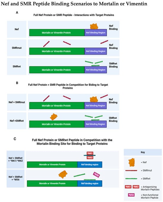 Binding scenarios involving Mortalin peptides competing with the SMR peptide, and the resulting effects on interactions between SMRwt and either Vimentin or Mortalin. (A) Full Nef protein or SMR peptide interactions with target proteins. (B) Full Nef protein + SMR peptide in competition for binding to target protein. (C) Full Nef protein or SMRwt peptide in competition with the Mortalin binding site for binding to target protein. Created with BioRender Brena, D (2025). https://BioRender.com/042t0rb (accessed on 5 September 2025).