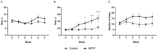 Time required to pass the beam walking test (A). Time required to pass the inclined grid walking test (B). The number of mistakes in the inclined grid walking test (C). N = 12 in the control group and N = 11 in the MPTP group. The data are presented as mean ± SEM. The significance of the differences between the groups was compared using the two-way ANOVA analysis with Sidak correction for multiple comparisons, *-p < 0.05, ***-p < 0.001, ****-p < 0.0001—as compared to the control group.