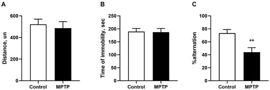 Total distance traveled in the open field test (A). The total duration of immobility in the tail suspension test (B). Evaluation of spatial working memory impairment in the Y-maze test (C). N = 12 in the control group, N = 11 in the MPTP group for open field test, N = 7 in the control group, and N = 6 in the MPTP group for tail-suspension test and Y-maze test. The data are presented as mean ± SEM. Groups were compared by t-test, **-p < 0.01 as compared to the control group.