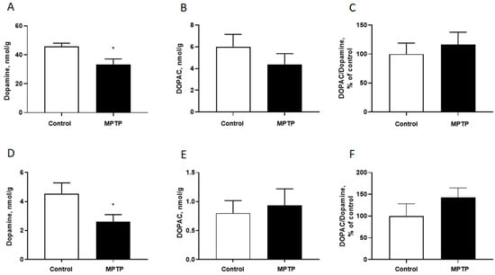 The content of dopamine (A), 3,4-Dihydroxyphenylacetic acid (DOPAC) (B), the DOPAC/Dopamine ration (C) in the striatum and in the cortex (D–F, respectively). N = 12 in the control group, N = 11 in the MPTP group. The data are presented as mean ± SEM. Groups were compared by t-test, *-p < 0.05 as compared to the control group.
