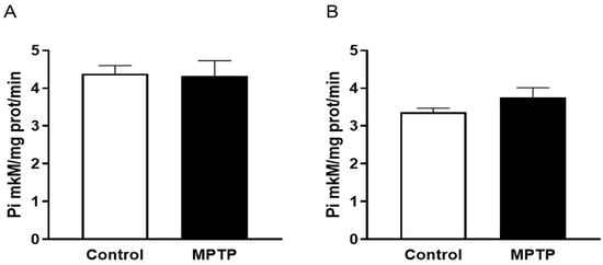 Na,K-ATPase uses up to 40% of the ATP synthesized by the brain, which suggests possible dysfunction of this enzyme due to a decrease in ATP levels in neurodegenerative diseases [,]. In the MPTP-induced murine parkinsonism model, a 40% decrease in the total activity of Na,K-ATPase was observed, accompanied by a 60% decrease in the amount of striatal dopamine []. In addition, a significant decrease in the activity of the enzyme (up to 60%) was observed under oxidative stress conditions upon the treatment of nerve growth factor (NGF) differentiated pheochromocytoma 12 (PC12) cells with MPP+ []. However, the present study revealed no changes in the Na,K-ATPase function in the midbrain and cerebellum at a dopamine depletion level of 34%, which implies the secondary enzyme dysfunction accompanied by a more severe damage to the dopaminergic system arising from ATP depletion in mitochondria.
