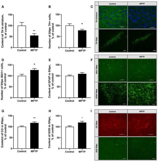 Changes in the staining intensity of tyrosinehydroxylase (TH) in the striatum as a percentage of the control in brightness gradations of an 8-bit image (A). Changes in the number of dopaminergic neurons in the SNpc (B). Changes in TH content in the striatum and in the SNpc after chronic exposure to MPTP at a dose of 3 mg/kg. The cut was made at 1.92 mm according to the Paxinos and Franklin atlas. Scale bar: TH striatum 50 µm (objective 40×), TH SNpc 100 µm (objective 10×) (C). Changes in the number of microglia cells in the SNpc (D). Changes in the staining intensity of glial fibrillary acidic protein (GFAP) in astrocytes in the SNpc as a percentage of the control in brightness gradations of an 8-bit image (E). Changes in the morphology of microglial cells and the content of GFAP in astrocytes in SNpc after chronic exposure to MPTP at a dose of 3 mg/kg. The cut was made at 1.80 mm according to the Paxinos and Franklin atlas. Scale bar: IBA1 SNpc 50 µm (objective 40×), GFAP SNpc 100 µm (objective 20×) (F). Changes in the staining intensity of cytochromeoxidase (CO) in the SNpc as a percentage of control in a 12-bit image (G). Change in the staining intensity of superoxidedismutase (SOD) in the SNpc as a percentage of the control in brightness gradations of the 8-bit image (H). Changes in the content of CO and SOD in the SNpc after the chronic action of MPTP at a dose of 3 mg/kg. The cut was made at 1.80 mm according to the Paxinos and Franklin atlas. Scale bar: CO SNpc 50 µm (objective 40×), SOD SNpc 50 µm (objective 20×) (I). N = 12 in the control group, N = 11 in the MPTP group. The data are presented as mean ± SEM. The groups were compared by t-test, *-p < 0.05, **-p < 0.01 as compared to the control group.