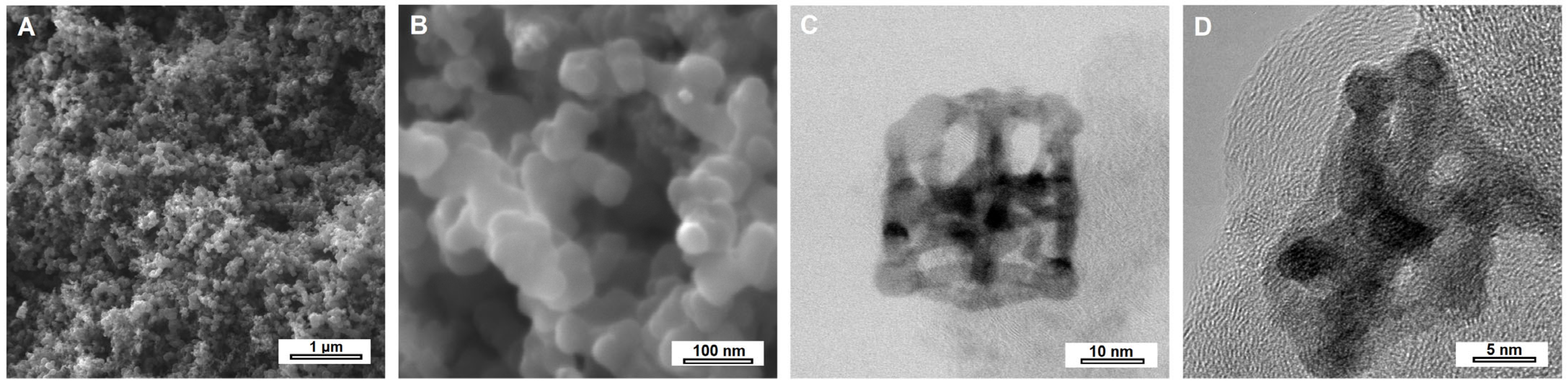 The microstructure of the obtained PtNiSnO2-CB was evaluated using an Apreo 2 scanning electron microscope (SEM) equipped with a T2 upper in-lens secondary electron detector. Images were acquired at an accelerating voltage of 5 kV. Transmission electron microscopy (TEM) imaging was performed at Titan 80–300 (FEI) Scanning Transmission Electron Microscope (S/TEM) using an accelerating voltage of 300 kV in bright-field, dark-field, and high-resolution modes. The elemental composition of the samples was analyzed using an energy-dispersive X-ray spectroscope (EDX) coupled with the TEM (EDAX). X-ray diffraction measurements were carried out with a PANalytical X’Pert Pro diffractometer (Malvern Panalytical Ltd., Almelo, The Netherlands) equipped with a copper anode source (Cu Kα radiation, λ = 0.154 nm). Data were collected in the 2θ range of 10° to 90°, using a step size of 0.02°. The diffraction patterns were analyzed and processed using X’Pert HighScore Plus 2.0 and Fityk 0.9.8 software. Raman spectra of the materials were collected using a Horiba LabRAM HR spectrometer (Horiba Scientific, Palaiseau, France) equipped with a laser excitation source (λ = 532 nm) and an Olympus Plan M NA0.9 objective lens. Spectra were recorded in the range of 50–4000 cm−1 with a spectral resolution of 0.39 cm−1. The integration time was set to 10 s, and four individual spectra were acquired at different sample locations to obtain precise and averaged structural information. The obtained spectra were analyzed using Fittyk 0.9.8 software. For spectral fitting and deconvolution, the Pseudo-Voigt function was applied.