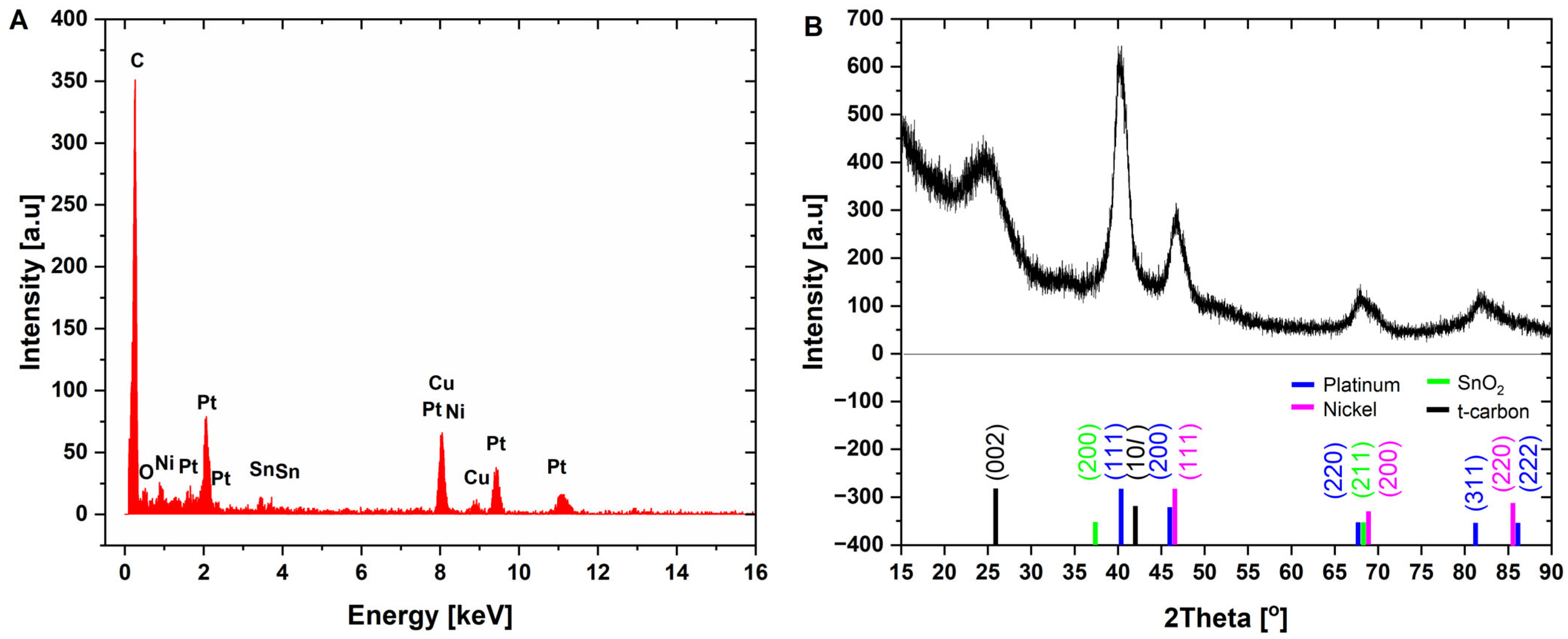 2 nanoparticle revealed presences of carbon (46.5%), platinum (43.7%), nickel (5.9%), tin (2.5%), oxygen (1.3%), and copper, the latter originating from the sample support mesh used during measurement. The XRD diffraction pattern shown in