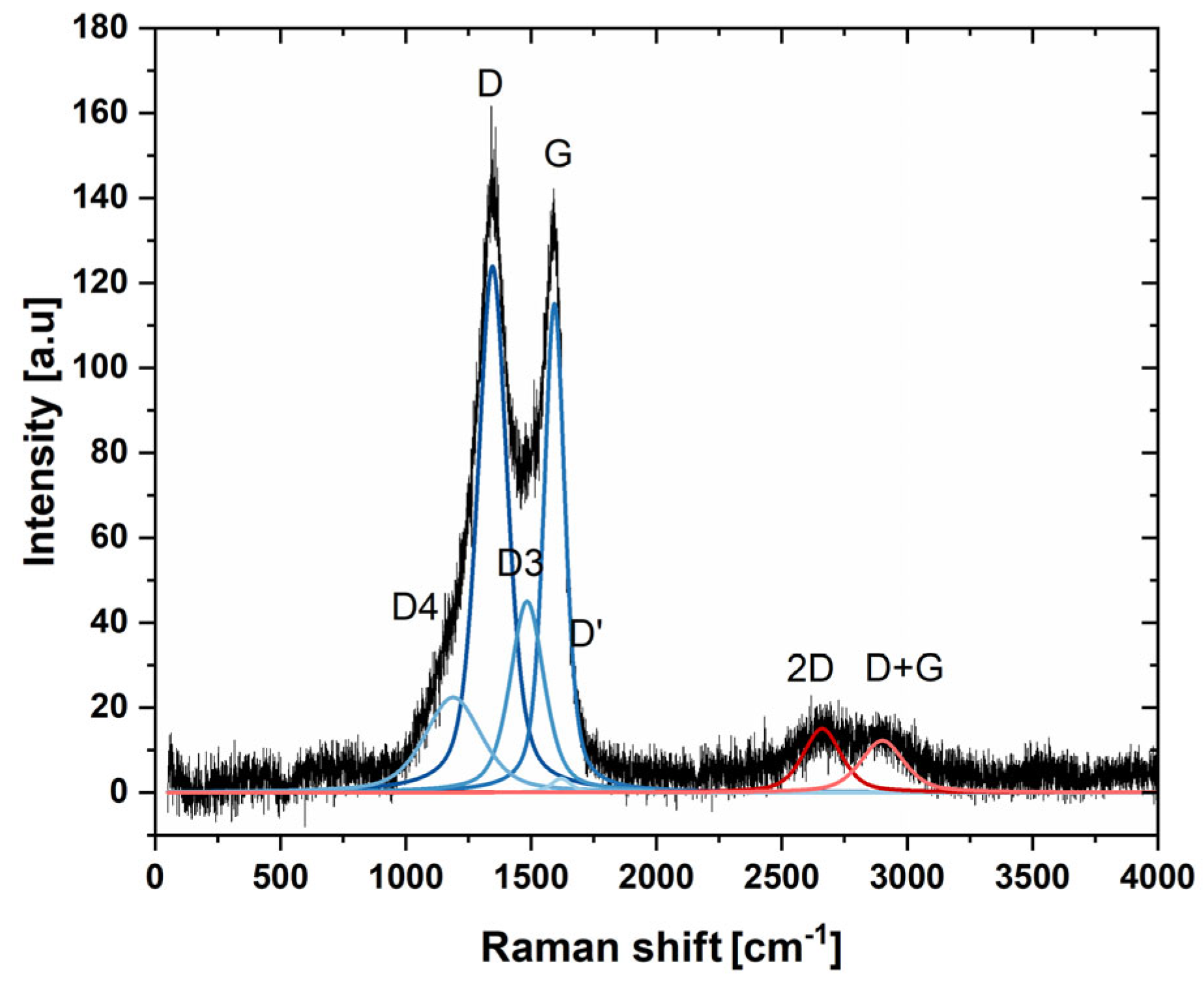 Figure 3. The spectra consisted first- and second-order bands, characteristic of strongly disordered turbostratic carbon. The first order spectrum was deconvoluted according to Sadezky 5-band model comprising D, D’, D3, D4, and G bands [