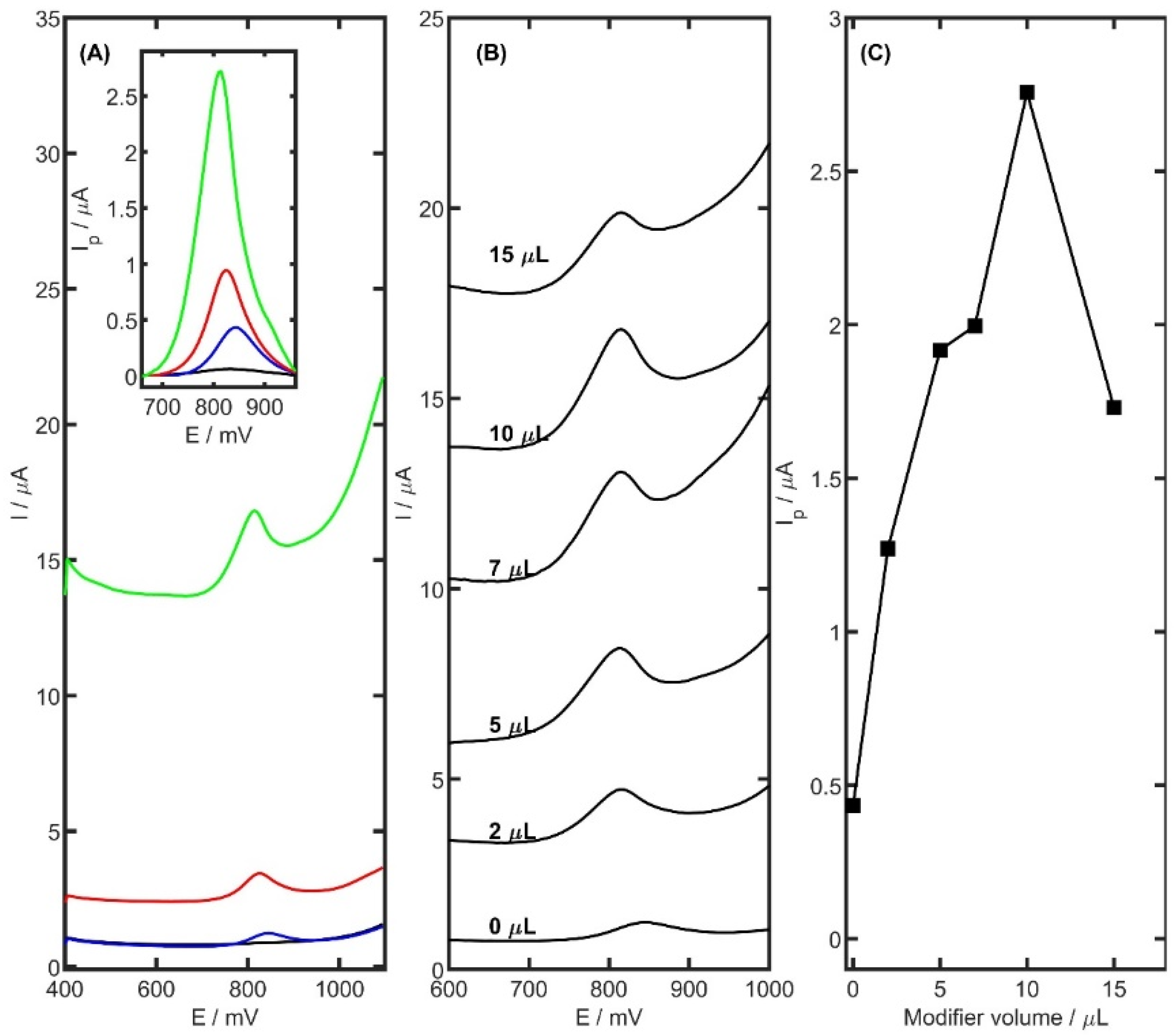 Figure 12A. The obtained slope of the regression line for the unmodified electrode and modified electrode was 0.129 ± 0.002 µA µM