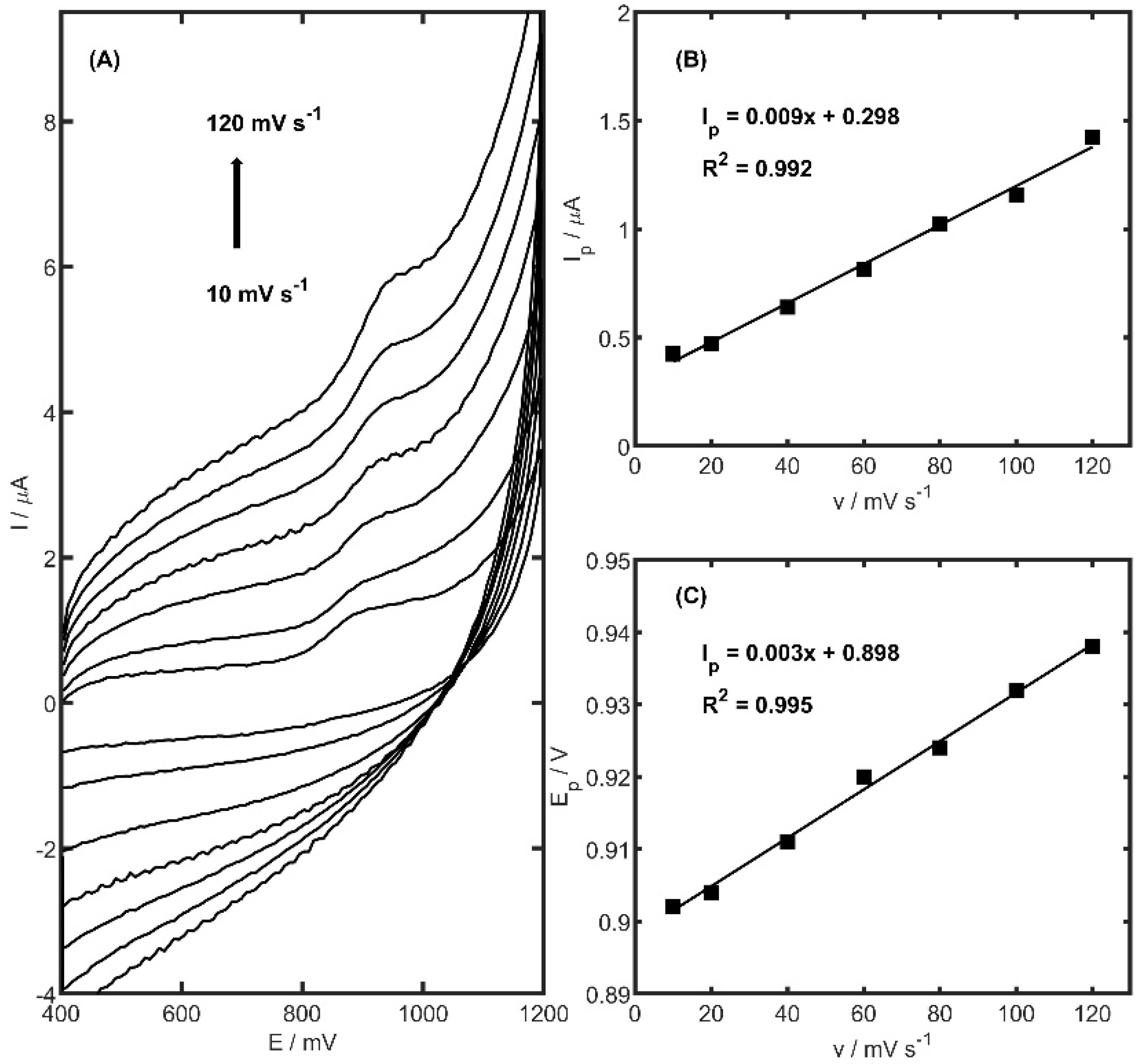 The well-defined voltammogram with symmetric anodic and cathodic peaks and a peak separation (ΔEp) of 52 mV was obtained for the bare GCE, indicating fast and reversible electron transfer. Modification with carbon black led to increased peak currents but also introduced a noticeable asymmetry between the oxidation and reduction peaks, and a broader ΔEp, suggesting perturbed charge transfer dynamics. A substantial enhancement in peak current was observed for the PtNiSnO2-CB/GC electrode compared to the unmodified GCE (38.78 µA vs. 13.21 µA, respectively). The redox peaks remained well-defined and nearly symmetrical, with an Ipa/Ipc ratio close to unity, demonstrating improved electron transfer efficiency despite the presence of a modifier layer.