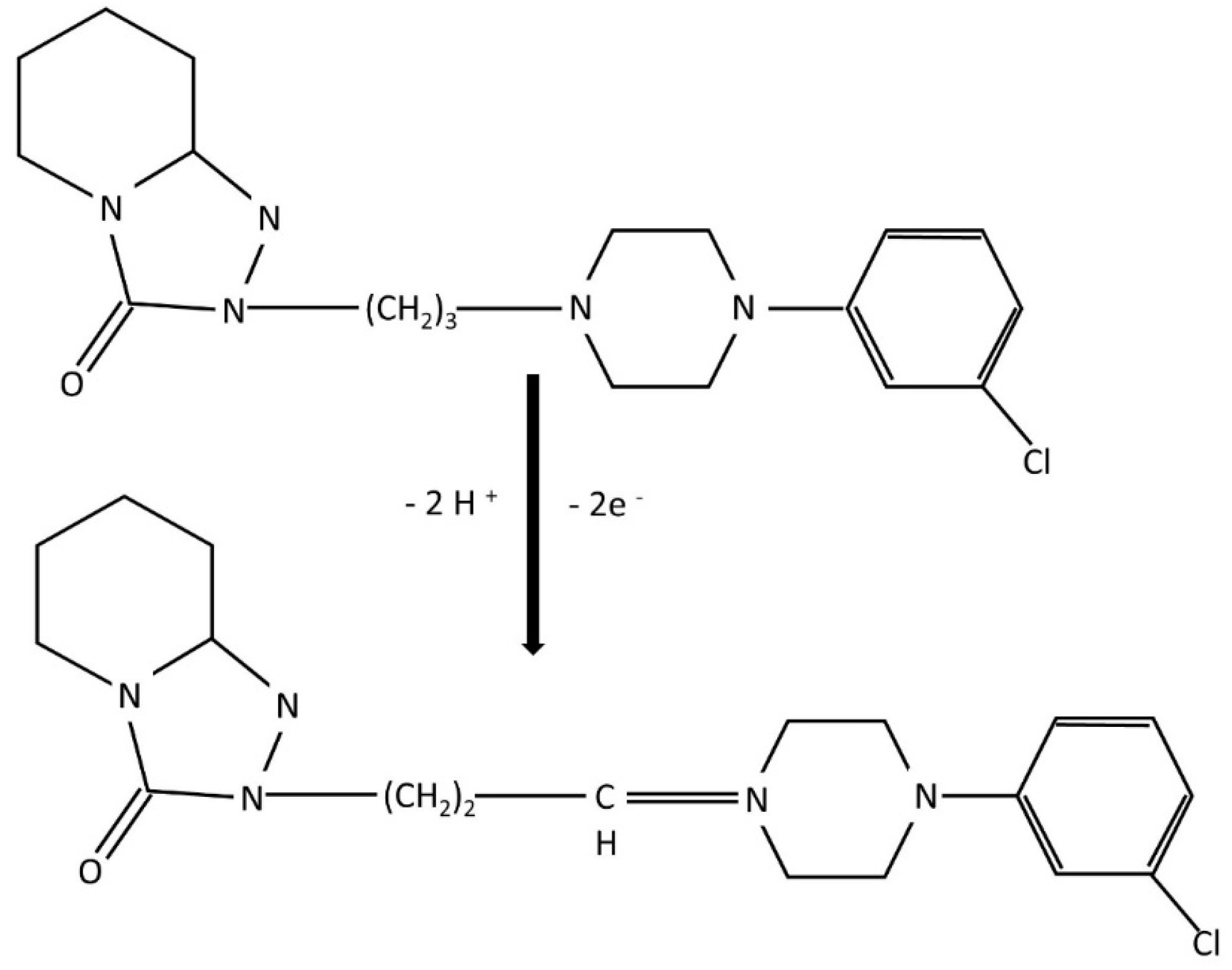 5]. TRZ is primarily metabolized in the liver by the cytochrome P450 isoform CYP3A4. The major metabolite formed through this pathway is 3-(1-chlorophenyl)piperazine, a serotonergic agonist with a long half-life. The most common adverse effects associated with TRZ administration include nausea, insomnia, agitation, dry mouth, constipation, headache, hypotension, blurred vision, and confusion [
