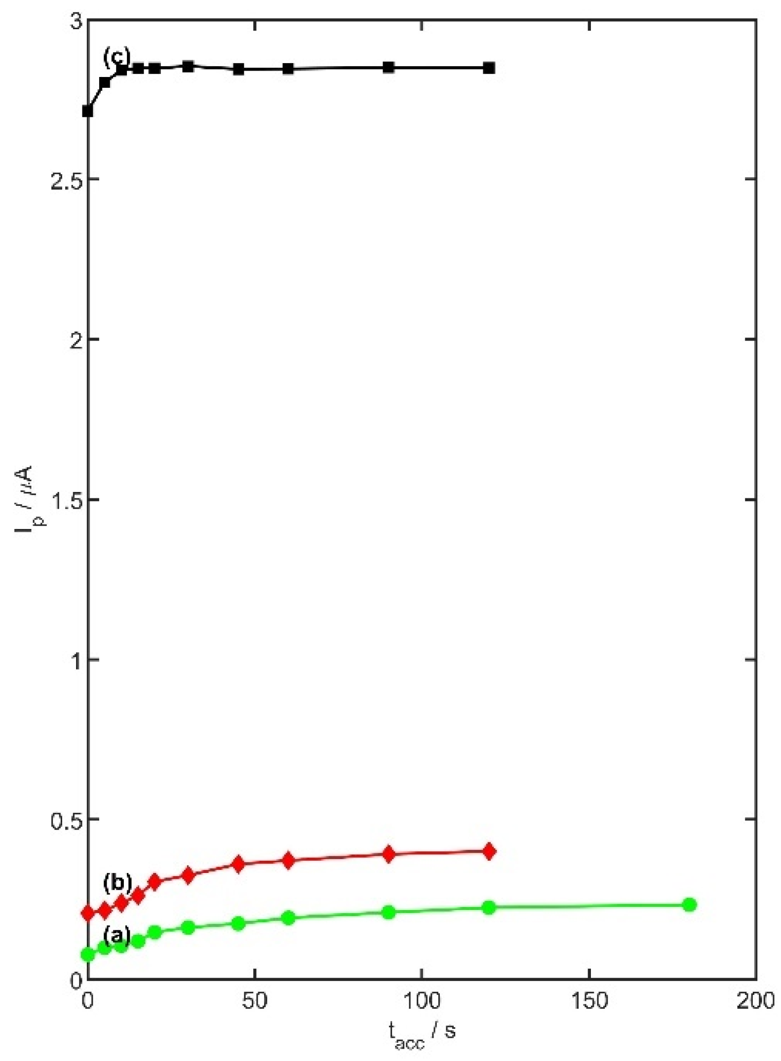 The effect of preconcentration time was also investigated under identical experimental conditions, with a fixed 15 s rest period between measurements. Accumulation times were varied from 0 to 180 s, and the corresponding peak current responses (