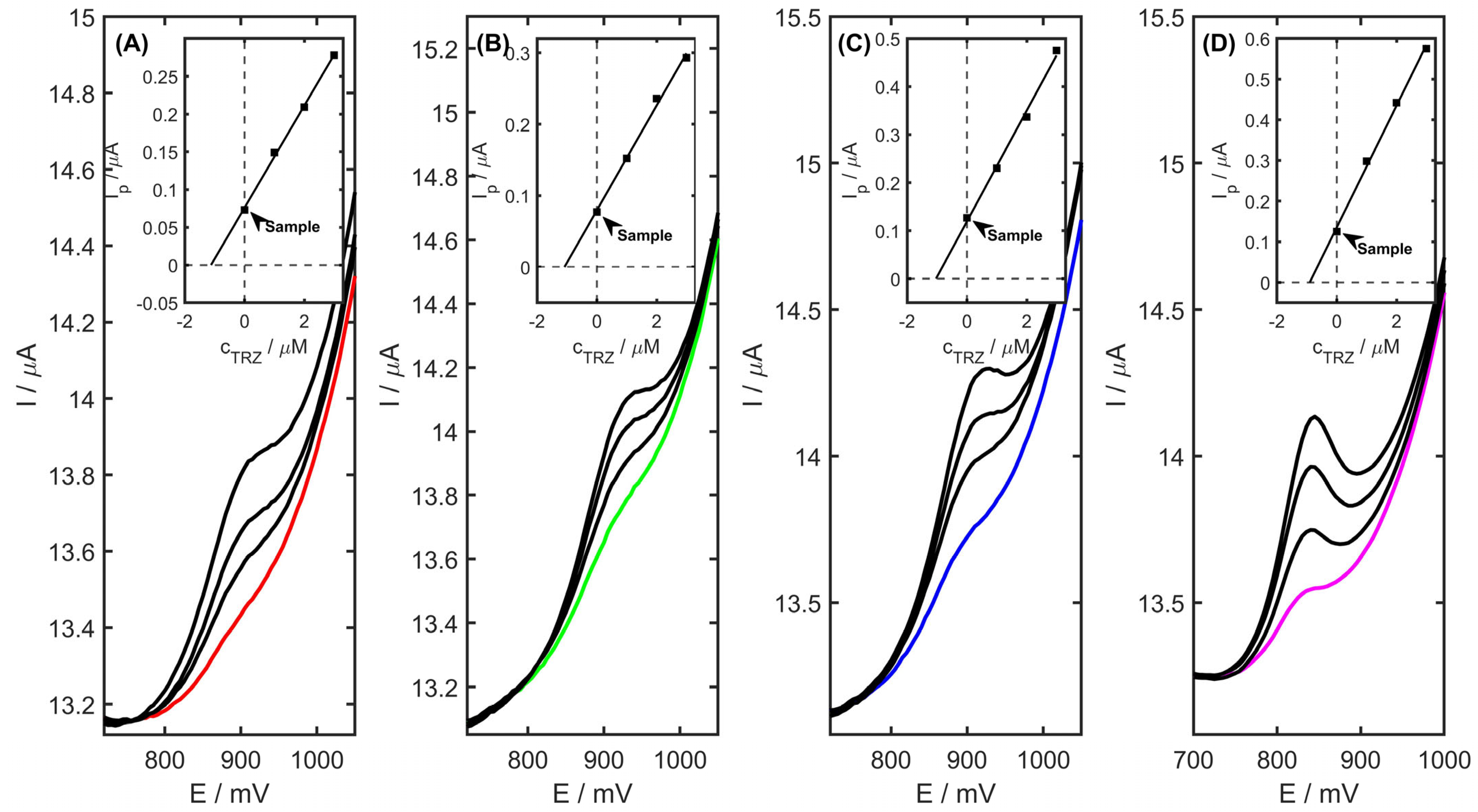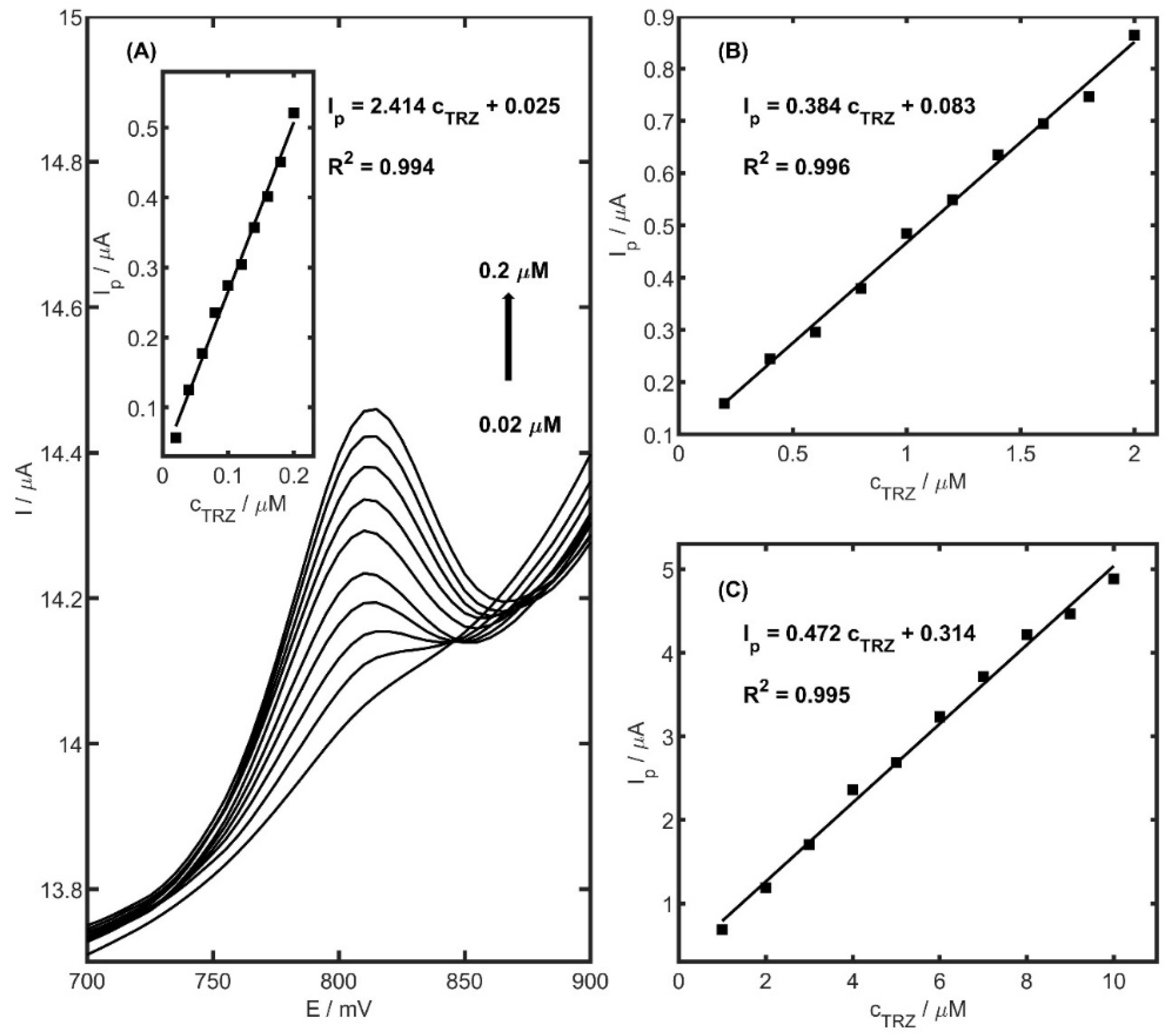 Figure 10 presents the voltammetric calibration responses alongside the corresponding calibration curves. The experiments were performed in 0.05 M acetate buffer (pH 5.0) using an accumulation potential of 400 mV. A linear response was obtained for TRZ within the concentration range of 0.02 to 0.2 µM (