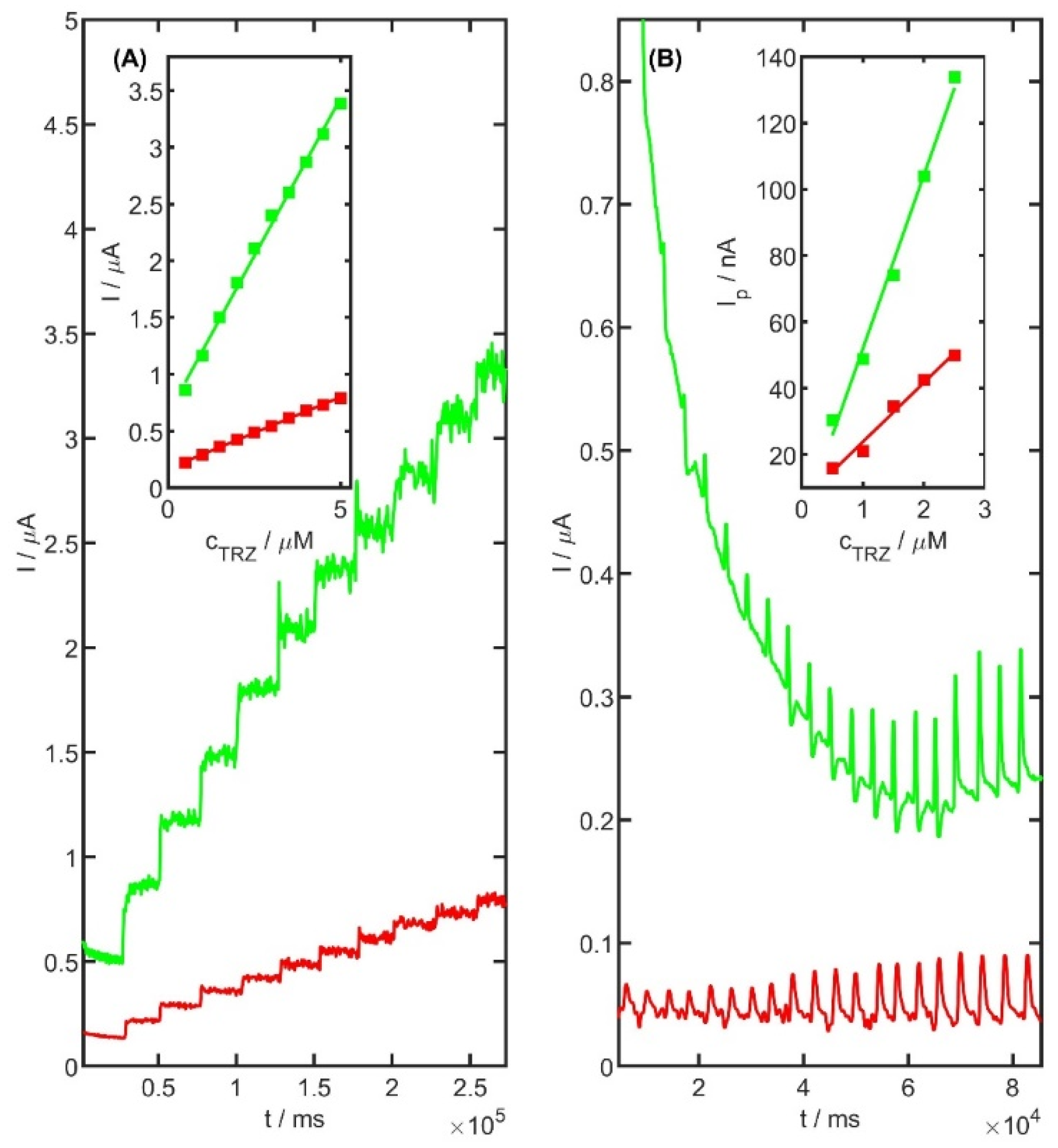 −1. The repeatability of the amperometric measurements, expressed as the relative standard deviation (RSD) for a 1 μM TRZ solution, was found to be 4.1% (