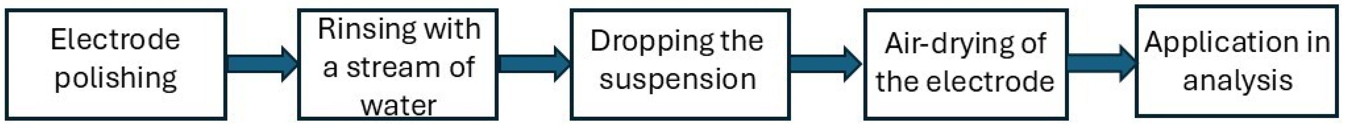 3 suspension, followed by thorough rinsing with a stream of double-distilled water. After the cleaning step, 10 µL of the prepared composite suspension was drop-cast onto the polished surface. The modified electrode was left to dry at room temperature for 8 h under a glass cover. The resulting electrode maintained its stability and functionality for up to two months. The scheme for the modification of the electrode is presented in