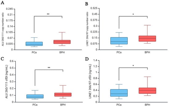 Tierno, D.; Pavan, N.; Giudici, F.; Grassi, G.; Valeri, E.; Zanconati, F.; Traunero, F.; Liguori, G.; Scaggiante, B. LINE-1 266/97 and ALU 260/111 Copy Number Ratios in Circulating Cell-Free DNA in Plasma as Potential Biomarkers for the Detection of Prostate Cancer: A Pilot Case-Control Study. Int. J. Mol. Sci. 2025, 26, 8862. https://doi.org/10.3390/ijms26188862
