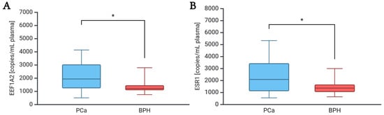 2.3. Evaluation of ccfDNA Quantity by EEF1A2 and ESR1 Copy Number in the Plasma of PCa and BPH Patients