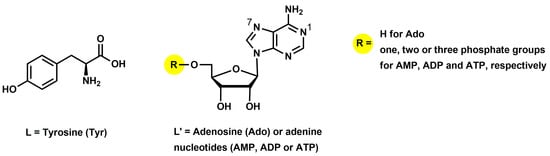 In a tyrosine molecule, the potential coordination centers are the carboxyl group, the phenolic hydroxyl group, and the amino group. The order of proton dissociation follows the typical pattern for amino acids with ionized groups. At the beginning, under acidic conditions, a proton dissociates from the carboxyl group. As the pH value increases, the amino group dissociates, followed by the hydroxyl phenolic [37,38]. The tyrosine protonation constants and overall stability constants (logβ) of the compounds formed in the binary system Cu(II)/Tyr have been reported in the literature previously [38,39,40,41,42,43]. The results obtained in our studies are in good agreement with those in the literature and were used to study the mixed ternary complexes. In Ado, AMP, ADP, and ATP molecules, the potential metal ion binding centers are endocyclic N(1) or N(7) nitrogen atoms from the purine ring, as well as phosphate groups from the nucleotides [44,45] (Figure 1). The sequence of adenosine nucleotide protonation is as follows: logKe of about 6.5—the protonation of the phosphate group; logKe of about 4.0—the protonation of the nitrogen atom; and logKe of 0.4, 1.02, and 1.7—the second site at the phosphate group in H3(AMP), H3(ADP), and H3(ATP), respectively [11,14]. Despite the higher basicity of the N(1) atom in the adenosine ring compared to that of N(7), the latter is the favored site for metal coordination [46,47]. Both the values of the protonation constants of these ligands and the stability constants (logβ) of the complexes in Cu(II)/Ado, Cu(II)/AMP, Cu(II)/ADP, and Cu(II)/ATP systems were determined earlier by our group [44,48,49,50] and, as for tyrosine, were used in the analysis of the ternary systems.