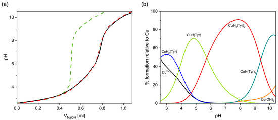 (a) Experimental and simulated titration curves for the Cu(II)/Tyr system: green—experimental curve (without complex formation); red—experimental curve; black—simulated curve (with complex formation); (b) distribution diagram for the Cu(II)/Tyr system, CCu2+ = 1 × 10−3 M, CTyr = 2 × 10−3 M.