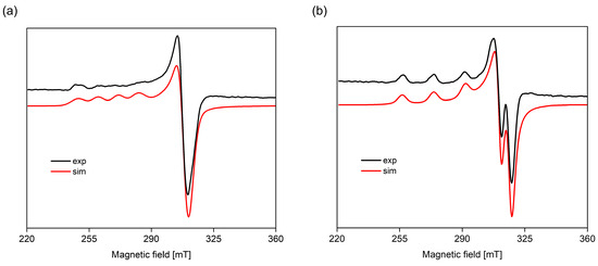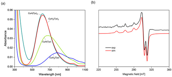 (a) The VIS spectra of the Cu(II)/Tyr system; (b) experimental and simulated EPR spectra for the Cu(II)/Tyr system at a pH = 10.2; CCu2+ = 1 × 10−3 M, CTyr = 2 × 10−3 M.