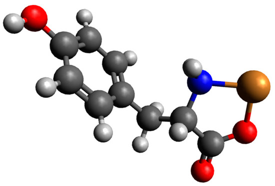 Preliminary geometry optimizations showed that for complexes involving one molecule of monoprotonated tyrosine with a copper(II) ion, only CuH(Tyr)_1 is likely to be observed. CuH(Tyr)_2 and CuH(Tyr)_3 structures after optimization are converted into CuH(Tyr)_1; see Figure S3. For complexes involving two molecules of H(Tyr) with a copper(II) ion, only one structure is likely to be observed, and it is the CuH2(Tyr)2_1 structure (CuH2(Tyr)2_2 and CuH2(Tyr)2_2 structures are converted into CuH2(Tyr)2_1 after optimizations); see Figure S4. For complexes consisting of H(Tyr) and Tyr molecules with a copper(II) ion, only two structures are likely to be observed: CuH2(Tyr)2_1 and CuH2(Tyr)2_2, (CuH2(Tyr)2_3 structure after optimization is converted into CuH2(Tyr)2_1); see Figure S5. Energy calculations for complexes consisting of one molecule of H(Tyr) and a copper(II) ion were conducted. The calculated energies, monomer sums, and interaction energies in an aqueous solution are presented in Table S2. These results indicate that the interaction energy was −176.6 kcal/mol. In this structure, tyrosine likely coordinates the copper ion via oxygen and nitrogen atoms. The optimized structure is presented in Figure 4, with the atomic coordinates provided in the supporting information (Table S3).