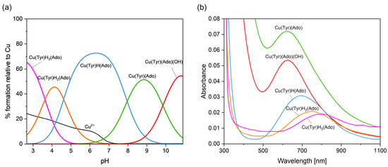 Figure 7 presents the distribution and VIS spectra of species forming in the analyzed system. The first Cu(Tyr)H3(Ado) species is present in the system within a pH range from 2.7 to about 5.0, where Ado is fully protonated and the binary complex CuH2(Tyr) is also present.
