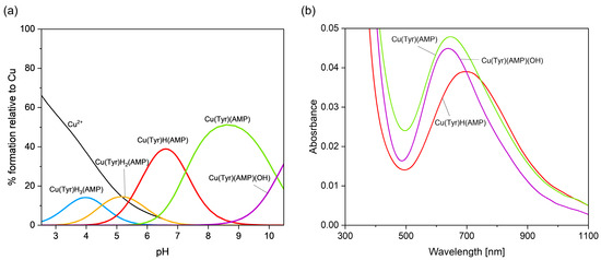 (a) The distribution diagram for the Cu(II)/Tyr/ADP system; the percentage of the species refers to the total Cu(II); (b) the VIS spectra of the Cu(II)/Tyr/ADP system; CCu2+ = 1 × 10−3 M, CL = L’ = 1 × 10−3 M.