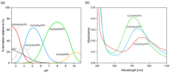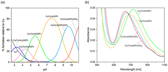 Computer analysis of the potentiometric data showed that in the system studied, at a pH below 3.0 (Figure 10a), the Cu(Tyr)H3(ADP) complex appears. Within the same pH range, in binary systems, CuH2(Tyr) and CuH(ADP), as well as H(ADP) [44], form. The equilibrium constant for Cu(Tyr)H3(ADP) logKe = logβCu(Tyr)H3(ADP) − logβCuH2(Tyr) − logβH(ADP) = 4.71 is in good accordance with logKe = 4.29 for CuH(ADP), which could suggest a similar mode of coordination of the ADP molecule in binary and ternary species, i.e., {1N,1O} [44]. Unfortunately, for Cu(Tyr)H3(ADP), similarly to Cu(Tyr)H2(ADP), the concentrations of binary forms in the pH range of ternary species formation were high enough to make a spectroscopic analysis impossible.