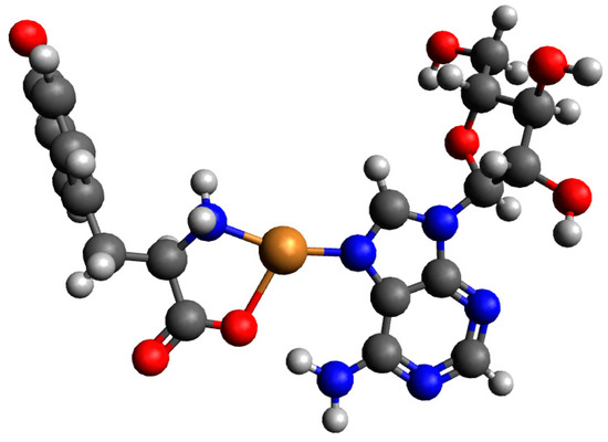 Preliminary optimization showed that for complexes consisting of one molecule of Tyr as well as one Ado molecule, Cu(Tyr)(Ado)_1 and Cu(Tyr)(Ado)_2 are likely to be observed (Figure S9). In Table S8, the calculated energies, sums of monomers, and interaction energies of possible complexes of Tyr and Ado molecules with copper(II) ions are presented. These results show that the strongest interaction energy among these complexes occurs in the Cu(Tyr)(Ado)_2 complex, with an interaction energy of −251.5 kcal/mol, and tyrosine coordinates with a copper(II) ion via nitrogen and oxygen atoms, while adenosine coordinates only via a nitrogen N(7) atom (simultaneous coordination with nitrogen N(1) and nitrogen N(7) atoms is not possible for steric reasons [44,45]). The optimized structure of this complex is depicted in Figure 12, and the coordinates of both obtained structures are included in Table S9 of the supporting information.