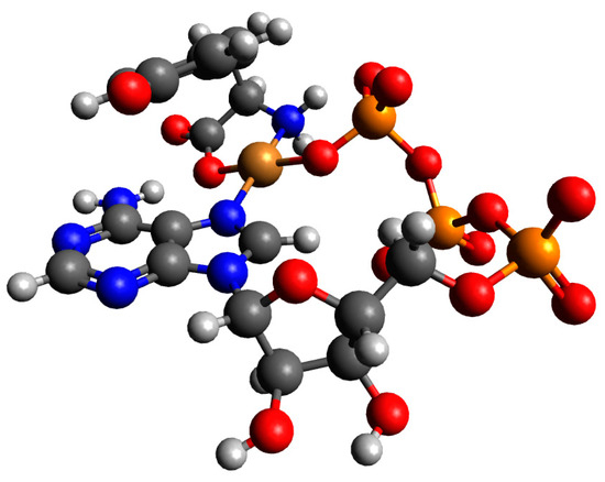 Another complex, i.e., Cu(Tyr)H3(ATP) is observed at a pH where a mixture of tetraprotonated as well as diprotonated forms also occurs at high concentrations (Figure 11a). For this reason, VIS and EPR spectroscopic studies were not performed, and consequently, it was not possible to clearly determine the mode of interaction in this species. However, Cu(Tyr)H3(ATP) is formed in accordance with the reaction CuH2(Tyr) + H(ATP) ⇌ Cu(Tyr)H3(ATP), which suggests that only the oxygen atom from the -COO− group of tyrosine and the oxygen and nitrogen atoms from the purine ring of ATP can participate in the metalation. With an increasing pH and the complete deprotonation of ATP, the Cu(Tyr)H2(ATP) complex is formed, which binds 60% of the copper(II) ions at a higher pH (Figure 11a). An analysis of the spectroscopic data at a pH = 5.2 (λmax = 760 nm, g|| = 2.363, and A|| = 147 × 10−4 cm−1) indicates the formation of the {1N,1O}-type chromophore, and they are in the good agreement with the results obtained for analogous coordination systems [61,62]. At this pH, the -NH3+ and -OH groups of tyrosine are blocked from the interaction, and hence, only the oxygen atom from the -COO− group of this ligand can participate in the coordination. This indicates that ATP coordinates with the copper(II) ion in this ternary species, differently from the Cu(ATP) complex ({1N,1O} [50]), i.e., with the participation of only the nitrogen atom from the purine ring, while the phosphate groups are outside the coordination sphere. A monoprotonated Cu(Tyr)H(ATP) species is formed at a pH above 4.0 (Figure 11a). Under the conditions of this complex dominating, at a pH close to 8.0, the NH3+ group of Tyr becomes deprotonated and can participate in metal coordination. The shift in the maximum absorption band towards shorter wavelengths λmax = 705 nm, as well as changes in the EPR parameters (Table 4), relative to those of Cu(Tyr)H2(ATP), clearly indicates the involvement of another atom in the interaction with the metal ion with the {2N,2O} chromophore. Which donor centers directly take part in coordination was established on the basis of quantum-chemical studies. With the deprotonation of the –OH group of tyrosine, a Cu(Tyr)(ATP) complex is formed (Figure 11b). Unfortunately, at the pH at which this species forms, the binary CuH(Tyr)2 form is also observed at a significant concentration, which prevents a spectroscopic analysis. Therefore, the mode of coordination was determined through quantum-chemical calculations (see Section 2.3.4).