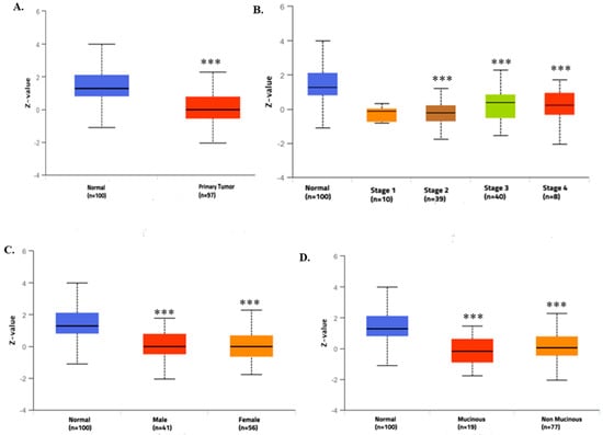 - Chandrashekar, D.S.; Karthikeyan, S.K.; Korla, P.K.; Patel, H.; Shovon, A.R.; Athar, M.; Netto, G.J.; Qin, Z.S.; Kumar, S.; Manne, U.; et al. UALCAN: An update to the integrated cancer data analysis platform. Neoplasia 2022, 25, 18–27. [Google Scholar] [CrossRef] [PubMed]
