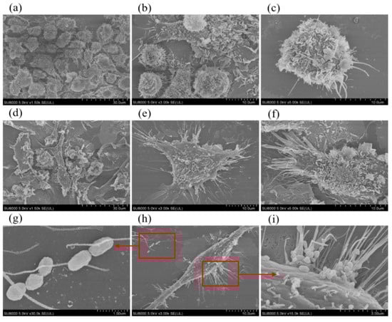 Morphological changes in cell surface before and after Brucella melitensis M5+gfp infection were observed by SEM. Note: (a) Mouse BMDCs on day 7 of culture (×1500); (b) Mouse BMDCs on day 7 of culture (×3000); (c) Mouse BMDCs on day 7 of culture (×5000); (d) Mouse BMDCs after Brucella melitensis M5+gfp infestation (×1500); (e) Mouse BMDCs after Brucella melitensis M5+gfp infestation (×3000); (f) Mouse BMDCs after Brucella melitensis M5+gfp infestation (×5000); (g) Brucella melitensis M5+gfp morphology (×30,000); (h) Mouse BMDCs after Brucella melitensis M5+gfp infestation (×3000); (i) Brucella melitensis M5+gfp attached to the cell surface (×15,000).