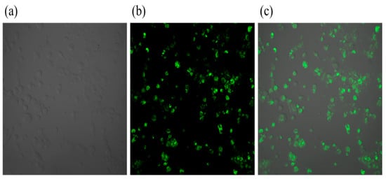 Laser confocal microscopy after Brucella melitensis M5+gfp infestation of BMDCs in mice. Note: (a) Represents a shaded outline of mouse BMDCs under natural light; (b) Represents Brucella melitensis containing the GFP gene, with the GFP gene protein expressed as green fluorescence; (c) Represents an overlay of (a,b).
