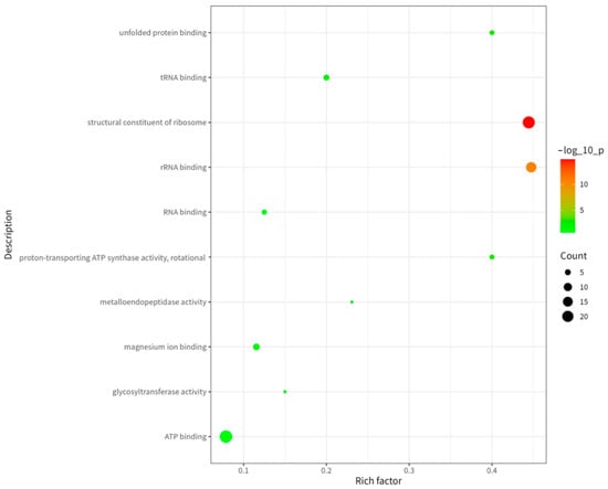 To deeply analyze the functional characteristics of these proteins, we performed Gene Ontology (GO) analysis. As shown in Figure 4, among molecular functions (MF), the categories “ATP-binding”, “rRNA-binding” and “magnesium ion-binding” were most significantly enriched. This indicates enrichment of proteins associated with energy metabolism, protein synthesis, and enzymatic activity in the immunopeptidome. ATP-binding proteins play key roles in cellular energy metabolism [], rRNA-binding proteins serve as essential ribosomal components for protein synthesis [], and magnesium ion-binding proteins participate in diverse enzymatic reactions [].