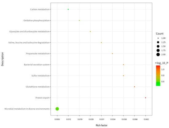 As shown in Figure 7, KEGG enrichment analysis revealed the immunopeptidome’s involvement in two principal functional modules: metabolic regulation and material transport. Metabolic pathways predominated the enrichment profile (8 entries), forming the energetic and biosynthetic foundation for immune responses. Carbon metabolism and oxidative phosphorylation emerged as significantly enriched pathways, reflecting their role as primary ATP sources that support heightened immune cell activation states requiring substantial energy for proliferation and effector molecule synthesis []. Concurrently, glutathione metabolism establishes crucial antioxidant defense through reduced glutathione synthesis, protecting immune cells from ROS damage during inflammatory responses. Branched-chain amino acid degradation pathways provide essential amino acids while potentially modulating mTOR signaling to regulate T-cell activation []. whereas microbial-associated metabolic pathways suggest gut microbiota regulation of immune function through metabolite-mediated crosstalk [].