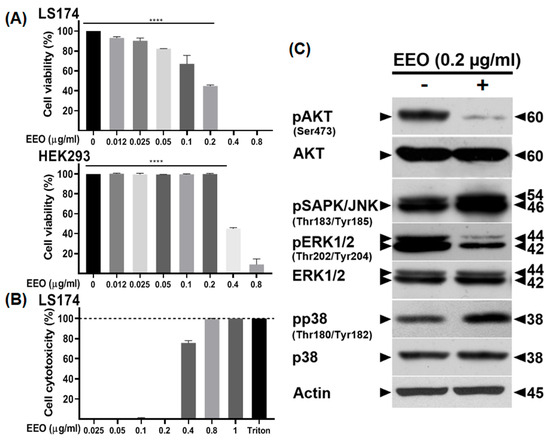 Due to the critical role of the MAPK and AKT signaling pathways in regulating cellular growth and survival in colorectal cancer [21,33,34], targeting their components is considered a valuable approach in the anticancer therapy. For this reason, we investigated whether EEO-induced inhibition of LS174 cell viability could affect ERK1/2, p38, JNKs and AKT kinases. Notably, we found that EEO-induced cell death in LS174 cells was associated with the inhibition of ERK1/2 and AKT, along with the activation of p38 and JNK kinases. Our data are in agreement with previous studies reporting an inhibition of ERK activity in colorectal cancer associated with reduced tumor growth [35]. Moreover, the inhibition of the AKT/ERK signaling pathway has also been reported to reduce the proliferation, migration, invasion, and angiogenesis in colon cancer cells [36]. Our data further support previous reports showing that modulation of the MAPK activity, through ERK inhibition and JNK activation, contributes to the induction of apoptotic pathways in intestinal cells [37]. Indeed, activation of JNK signaling has been shown to reduce the proliferation and promote cell death in colon cancer cell lines [38,39,40]. In agreement with our result, it has also been reported that many chemotherapeutic agents induce apoptosis in colon cancer cells by activating the p38 kinase [41,42,43,44].