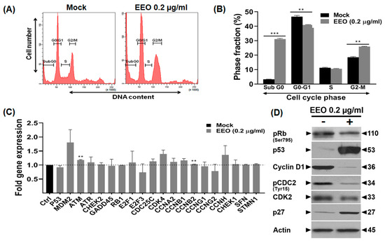 EEO induces cell cycle arrest in human colon adenocarcinoma LS174 cells by targeting various cell cycle regulatory proteins. Exponentially growing LS174 cells were treated with EEO (0.2 µg/mL) or vehicle (DMSO) for 24 h. (A) Cell cycle distribution was analyzed by flow cytometry following propidium iodide staining. (B) Quantification of cell populations in G0/G1, S, and G2/M phases is presented as percentage values. (C) The levels of mRNA transcripts were quantified by real time PCR. The control values were normalized to 1. (D) Whole cell lysates were analyzed on SDS-PAGE gel and probed with the indicated antibodies for Western blot analysis. Actin was used as loading control. Data represent the means ± SE of three separate experiments. Statistical differences were analyzed with Student’s t-test (** p < 0.01, and *** p < 0.001 as compared to the control).
