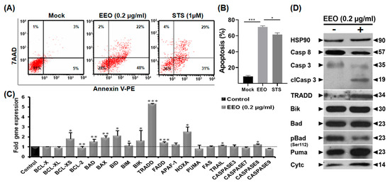The fact that EEO treatment led to the inhibition of LS174 cell viability along with morphological changes and an increase in the sub-G0 population suggest that these cells might have undergone apoptosis. To characterize this process, we quantified the percentage of apoptotic cells by flow cytometry following Annexin-V staining. As shown in Figure 3A,B, EEO at a concentration of 0.2 µg/mL induced a significant increase in the percentage of apoptotic LS174 cells (71%) compared to mock-treated cells. This result suggests that the inhibition of LS174 cell viability by EEO is concomitant to the induction of apoptotic cell death. Hence, to better elucidate the mechanisms underlying this process, we investigated the impact of EEO on several cellular effectors by measuring the expression levels of some genes related to apoptotic cell death. EEO treatment led to up-regulation in the expression of pro-apoptotic B-cell lymphoma 2 (BCL-2) interacting mediator of cell death (BIM), BCL2-interacting killer (BIK), BCL-2-associated agonist of cell death (BAD) and Bcl-2–associated X protein (BAX) genes, in LS174-treated cells. We also noticed an increase in the expression of the TNFR1-associated death domain protein (TRADD) and Fas-associated death domain protein (FADD) along with a significant up-regulation of TNF-related apoptosis-inducing ligand (TRAIL). In addition, EEO increased the expression of caspase 8, and two inhibitors of the anti-apoptotic protein BCL-2, the Phorbol-12-myristate-13-acetate-induced protein 1 (NOXA) and BCL-XS transcripts (Figure 3C). These findings suggest that EEO activates the mitochondria-mediated apoptotic pathway by changing the balance between pro-apoptotic and anti-apoptotic genes.