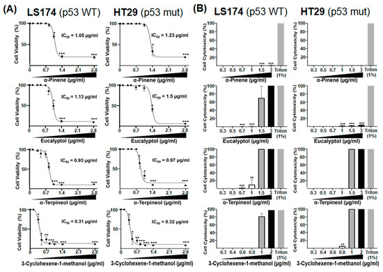 To verify whether the inhibitory effect on HT29 and LS174 cell viability induced by the tested compounds was associated with cytoxicity, we performed the LDH release assay to quantify the lactate dehydrogenase release as a consequence of the loss of membrane integrity. Compared to the positive control of 100% toxicity induced by Triton, we found that 24 h treatment of HT29 cells with α-Pinene and Eucalyptol did not induce LDH release (Figure S1). Similarly, treatment of cells with α-Terpineol and 3-Cyclohexene-1-methanol at concentrations below 1 µg/mL was not associated with cell toxicity. However, concentrations above 1 µg/mL induced 100% toxicity (Figure 4B).
