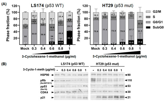 3-Cyclohexene-1-methanol induces cell cycle arrest in colon cancer cells. Exponentially growing LS174 and HT29 cells were treated with increasing concentrations of 3-Cyclohexene-1-methanol (0.3, 0.4, 0.6, 0.8, and 1 µg/mL) or with vehicle (DMSO) for 72 h. (A) Cell cycle distribution was analyzed by flow cytometry following propidium iodide (PI) staining. The histogram illustrates the relative proportions of cells in the sub-G0, G0/G1, S, and G2/M phases of the cell cycle. (B) Whole-cell lysates were resolved by SDS-PAGE and analyzed by Western blotting using the specified antibodies. HSP90 was employed as a loading control.