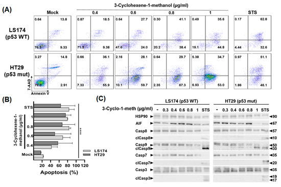 3-Cyclohexene-1-methanol induces apoptosis of LS174 and HT29 colon cancer cells regardless of p53 status. Exponentially growing LS174 and HT29 cells were treated with increasing concentrations of 3-Cyclohexene-1-methanol (0.4, 0.6, 0.8, and 1 µg/mL)) or with vehicle (DMSO) for 72 h. (A) Apoptosis was assessed by flow cytometry following Annexin V/7-AAD staining. Staurosporin (1 µM) was used as a positive control for apoptosis induction. Representative flow cytometry dot plots show the distribution of viable (Annexin V−/7-AAD−), early apoptotic (Annexin V+/7-AAD−), and late apoptotic (Annexin V+/7-AAD+) or necrotic (Annexin V−/7-AAD+) cell populations. (B) Quantitative analysis of apoptosis: the histogram illustrates the combined percentages of early and late apoptotic cells under each treatment condition. (C) Whole cell lysates were analyzed on SDS-PAGE gel and probed with the indicated antibodies for Western blot analysis. HSP90 was used as a control for equal loading Data are presented as mean ± standard error (SE) from three independent experiments (**** p < 0.0001 vs. control).
