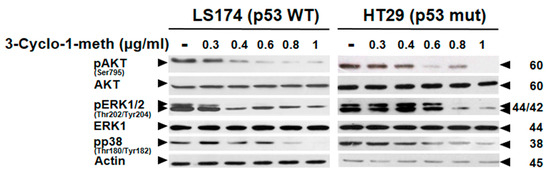 To further decipher the mechanisms underlying the 3-Cyclohexene-1-methanol-inhibitory effect on the viability of HT29 and LS174 cells, we examined its impact on the phosphorylation status of the pro-survival kinases AKT, ERK1/2, and p38. As shown in Figure 7, immunoblot analysis revealed a progressive inhibition of AKT phosphorylation starting at 0.4 µg/mL in LS174 cells and at 0.6 µg/mL in HT29 cells. Moreover, 3-Cyclohexene-1-methanol induced the dephosphorylation of ERK1/2 kinases beginning at 0.4 µg/mL in LS174 cells and at 0.8 µg/mL in HT29 cells. Similarly, a reduction in p38 was observed starting at 0.4 µg/mL in LS174 cells and at 0.8 µg/mL in HT29 cells. These findings suggest that 3-Cyclohexene-1-methanol disrupts AKT, ERK1/2, and p38 signaling -key components of survival and proliferation pathways-thereby contributing to reduced cell viability, cell cycle perturbation and apoptosis in both cell lines.