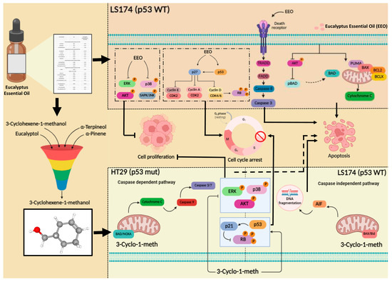 In this study, we investigated the role of the p53 protein in the pharmacological activity of the four major compounds of EEO using two colorectal cancer cell lines: LS174 (wild-type p53) and HT29 (mutated p53). Approximately 60% of colorectal cancers harbor mutations in the tumor suppressor gene encoding p53 [86,87]. These mutations lead to the functional inactivation of the p53 protein and are consequently associated with therapeutic failure due to the resistance of p53 mutant or deficient tumors to therapies [88]. Our results demonstrated that Eucalyptol, 3-Cyclohexene-1-methanol, α-Pinene, and α-terpineol effectively inhibited the proliferation of colorectal tumor cells, irrespective of their p53 status. These findings align with various studies reporting anti-tumor properties of some compounds identified in the chemical composition of EEO. Notably, 1,8-cineole (Eucalyptol) exhibited an antiproliferative effect on two colorectal HCT116 and RKO cancer cells via the modulation of survivin, and the activation of Akt and p38 pathways. The anti-tumor activity of Eucalyptol has been associated with the induction of cell apoptosis through Poly(ADP-ribose) polymerase (PARP) cleavage and the activation of caspase-3 [56] as well as inhibition of colorectal tumor cell viability through suppression of NF-κBp65/JAK and Bcl-2/Caspase signaling pathways [89].