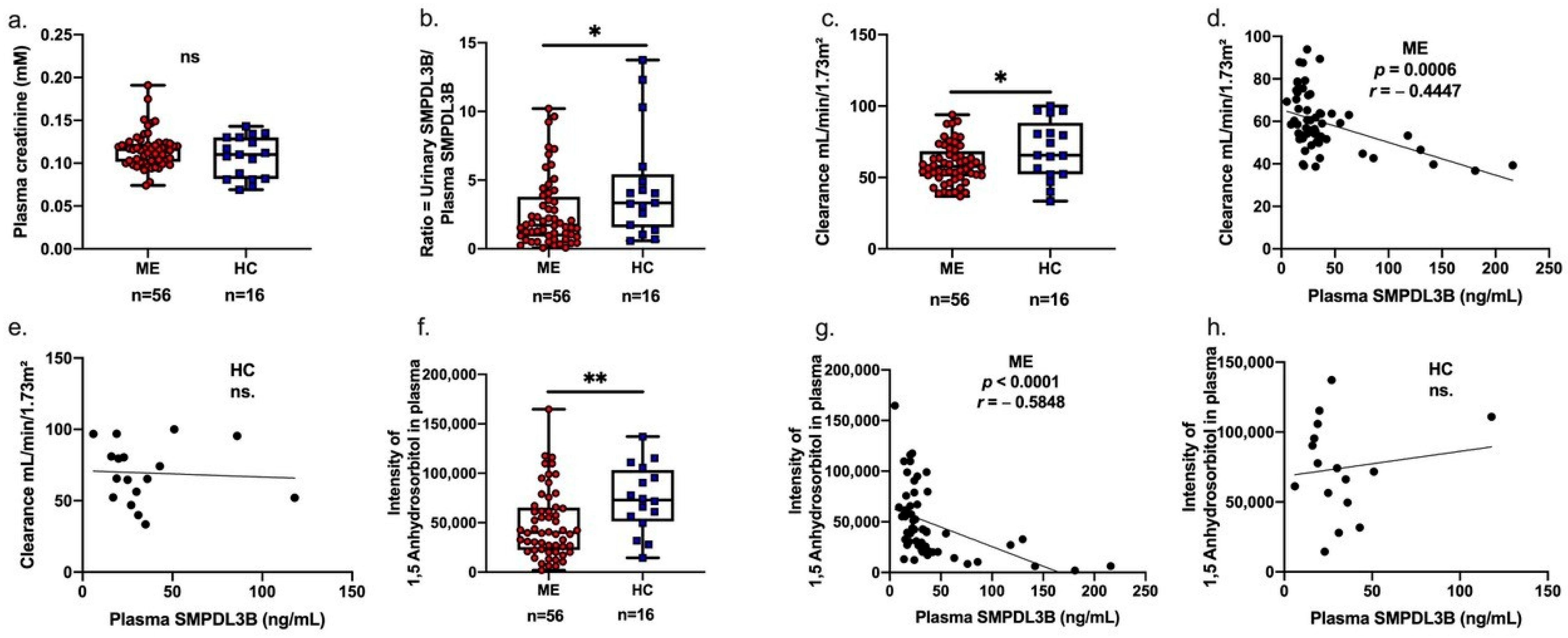 2.2. Associations Between Soluble SMPDL3B, 1,5-Anhydrosorbitol, and Renal Function in Patients with ME